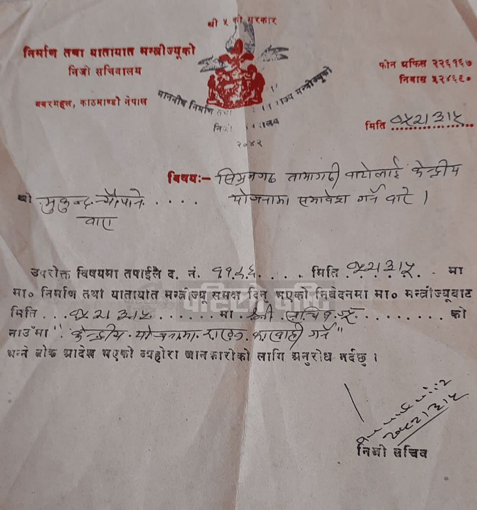 सोही क्रममा सडक खन्न भनेर विभागबाट ल्याइएको एक थान डोजर तत्कालिन निर्माण तथा यातायात मन्त्री खुमबहादुर खडकाको निर्देशनमा फिर्ता गर्न समेत लगाइएको थियो । वन विभागले जनप्रतिनिधिहरुको सक्रियतामा सडक निर्माणको लागि रुख फडानी भएको पाइएको भन्दै नचल्ने निर्णय गरेपछि सो मुद्दा पछि निष्कृय भएको थियो । सोही समयदेखि निर्माण प्रकृयामा रहेको सो सडकको टेडाकट्टी क्षेत्रमा पर्ने करिव ५ सय मिटर क्षेत्र बाहेक हाल कालोपत्रे समेत भइसकेको छ ।