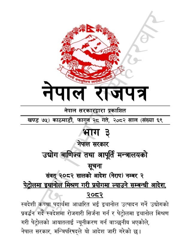 काठमाडौँ । सरकारले पेट्रोलमा इथानोल मिसाएर प्रयोग गर्ने नयाँ व्यवस्था लागू गरेको छ। मन्त्रिपरिषद्ले जारी गरेको ‘पेट्रोलमा इथानोल मिश्रण गरी प्रयोगमा ल्याउनेसम्बन्धी आदेश, २०८२’ राजपत्रमा प्रकाशित भएसँगै यो नीति कार्यान्वयनमा आएको हो। आदेशअनुसार नेपाल आयल निगमले उपलब्धताका आधारमा प्रतिलिटर पेट्रोलमा अधिकतम १० प्रतिशतसम्म इथानोल मिसाएर बिक्री गर्न सक्नेछ। आवश्यकताअनुसार इथानोलको मिश्रण अनुपात बढाउने वा घटाउने अधिकार मन्त्रिपरिषद्मा रहने व्यवस्था पनि गरिएको छ।
