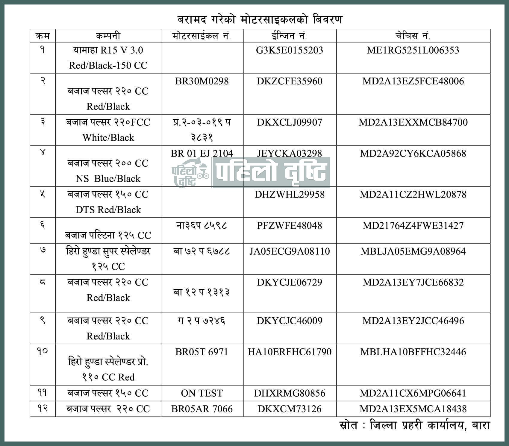 उनीहरूले बाराको कलैया, महागढी तथा आसपासको क्षेत्रबाट विभिन्न मितिमा चोरी गरेका बजाज र हिरोहोन्डा कम्पनीका एक दर्जन मोटरसाइकल बरामद गरेको प्रहरीले जनाएको छ ।
